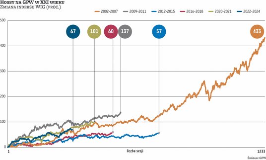 Obecna fala zwyżek na warszawskiej giełdzie rozpoczęła się 14 października 2022 r. Od tego czasu mija właśnie 15 miesięcy, w trakcie których WIG przeszedł od mocnego wyprzedania do nowych rekordów, które ustanawiał w ostatnich tygodniach. Pytanie, co dalej. Ile przed nami może być jeszcze wzrostowych miesięcy, nim hossa wyczerpie swój potencjał?