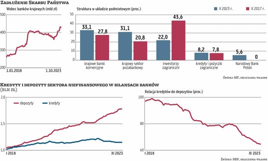 – Banki muszą coś z tą nadwyżką depozytów nad kredytami zrobić – mówi też Kamil Stolarski, kierownik zespołu analiz giełdowych w Santander BM. Można je „zainwestować” albo w bony pieniężne NBP, które mają jednak bardzo krótkie, zaledwie kilkudniowe, terminy zapadalności, albo w właśnie w dłuższe instrumenty dłużne.