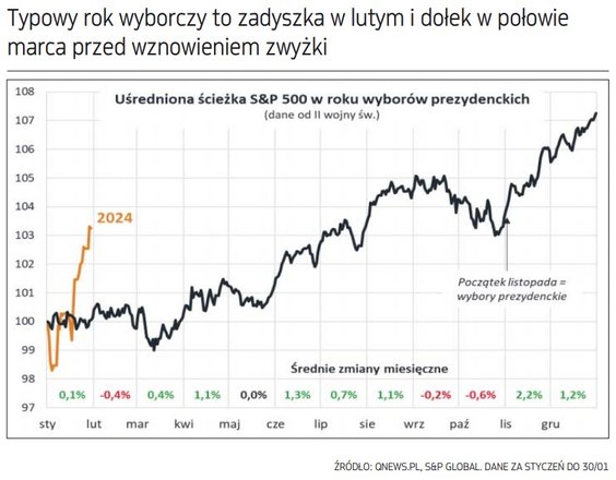 A jakie implikacje płyną z kolejnej statystycznej koncepcji, czyli cyklu prezydenckiego? Przypomnijmy, że rok wyborczy na tle pozostałych lat w ramach cyklu prezydenckiego to przysłowiowy „średniak” – ani najbardziej udany (bo najlepszy statystycznie jest rok przedwyborczy, co potwierdziło się znów w 2023 r.), ani też najsłabszy (tak jak drugi rok po wyborach – ostatnio 2022 r.). Przeciętna zmiana S&P 500 w roku wyborczym to ok. +7 proc.