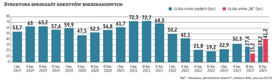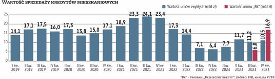 – W 2024 r. spodziewamy się 13-proc. wzrostu rok do roku wartości udzielonych kredytów mieszkaniowych, do 72 mld zł – powiedział Mariusz Cholewa, prezes BIK-u. Przy jakich założeniach powstały te szacunki? Prezes powiedział, że choć skończył się program „Bk”, to złożone do końca ub.r. wnioski są dalej rozpatrywane przez banki: między wnioskiem a uruchomieniem kredytu mijają zazwyczaj dwa, trzy miesiące – w I kwartale br. będzie więc widać dalej wpływ „Bk”. W II kwartale można się spodziewać wyhamowania akcji kredytowej, a w II półroczu ponownego wzrostu dzięki programowi „Na start”. BIK spodziewa się spadku inflacji, ale nadal powyżej celu, wskazuje, że rynek oczekuje dalszych obniżek stóp, zakładany jest też wzrost gospodarczy stymulowany konsumpcją i wydatkami publicznymi. Wsparciem będą też wzrost płac i niskie bezrobocie.