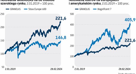 Stopa zwrotu GRANOLAS za ostatnie pięć lat wynosi ponad 120 proc. W tym czasie Stoxx Europe 600 zyskał 46 proc. Mimo iż nie wszystkie spółki z tego grona mogą pochwalić się dodatnią stopą zwrotu za ostatni rok, to grupa odpowiadała łącznie za 50 proc. wzrostów indeksu w ciągu ostatnich 12 miesięcy.