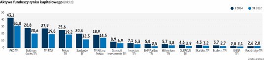 Jeszcze na koniec 2022 r. udział towarzystw funduszy inwestycyjnych należących do grup bankowych w aktywach funduszy rynku kapitałowego sięgał około 70 proc. Rok 2023 ogółem był dla branży bardzo udany, zarówno jeśli chodzi o sprzedaż, jak i wyniki zarządzania. Za sprawą tych drugich aktywa rosły niemal wszystkim, ale na wpłaty nowych środków mogły liczyć głównie bankowe TFI. W efekcie ich udział w rynku funduszy rynku kapitałowego w ciągu 14 ostatnich miesięcy urósł o kilka punktów procentowych w czasie, w którym łączne aktywa tychże funduszy zwiększyły się o 39 proc.