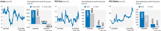 Powodów do zadowolenia nie ma również siostrzana spółka. PCC Exol w ubiegłym roku uplasował na rynku o ponad 1 tys. ton produktów więcej niż w 2022 r. Spadki cen były jednak tak duże, że i wyniki finansowe musiały mocno zmaleć. W efekcie w ubiegłym roku grupa zanotowała 20-proc. spadek przychodów, 53-proc. zniżkę EBITDA i o 65 proc. gorszy zysk netto.