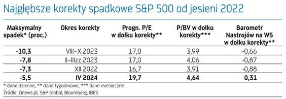 Jednocześnie jednak nie sposób twierdzić, że barometr zszedł tak nisko, jak w dołkach poprzednich trzech głębszych korekt spadkowych, w tym tej z jesieni ub.r. W tym ostatnim przypadku barometr zjechał do -0,66 pkt, co oznaczało dość silny rynkowy pesymizm. Z tego relatywnie niskiego pułapu wystartowała potem dynamiczna fala poprawy nastrojów, trwająca aż do marca br. W tabeli pokazujemy, że na wyraźnie ujemnych poziomach nasz barometr lądował także w przypadku pozostałych głębszych korekt.