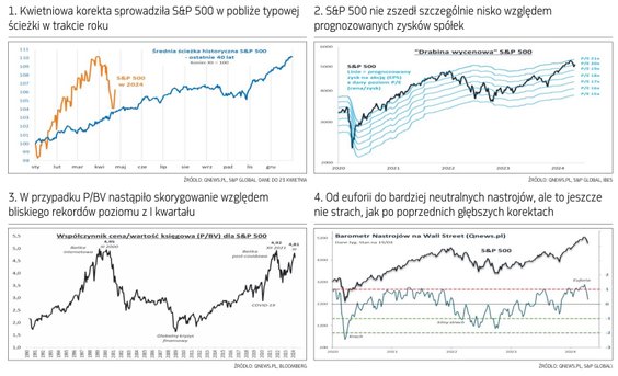 Mniejszy potencjał wynika też z innego umiejscowienia współczynnika ceny do wartości księgowej (P/BV). Na jesieni ub.r. startował on po korekcie z poziomu ok. 4,0, a na jesieni 2022 – z ok. 3,5. Na tym tle kwietniowe cofnięcie (4,64 w momencie pisania artykułu) nie wygląda szczególnie okazale. Zauważmy, że po fenomenalnym I kwartale P/BV wspiął się aż do 4,81, skąd brakowało już tylko 2–3 proc. do historycznych szczytów z lat 2021 i 2000 (bańka internetowa).