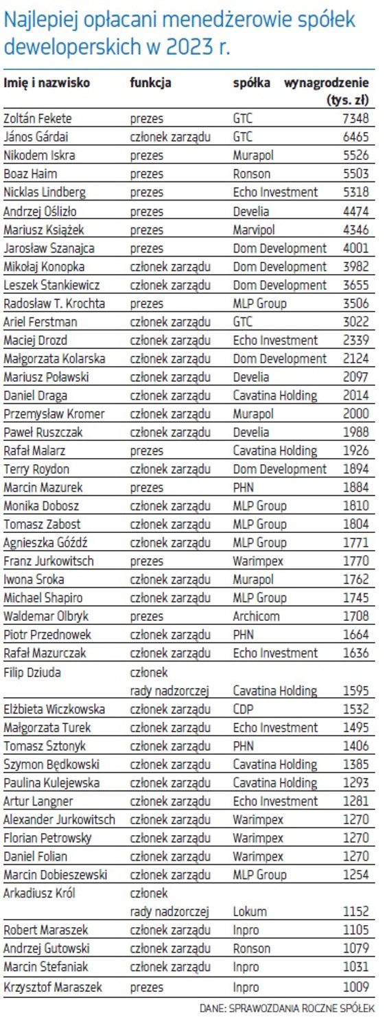 Z zestawienia wynika, że ponad dwie trzecie osób zarobiło więcej niż w 2022 r. Wynagrodzenia w spółkach składają się przeważnie z części stałej oraz premii uzależnionych od spełnienia postawionych przez radę nadzorczą warunków. To głównie wyniki finansowe wypracowane przez firmę w roku poprzedzającym, w pewnych przypadkach jest to wprost określony udział. Rok 2023 to zwłaszcza dla deweloperów mieszkaniowych okres wyśmienity – spółki księgowały sprzedaż lokali z okresu boomu w 2021 r.