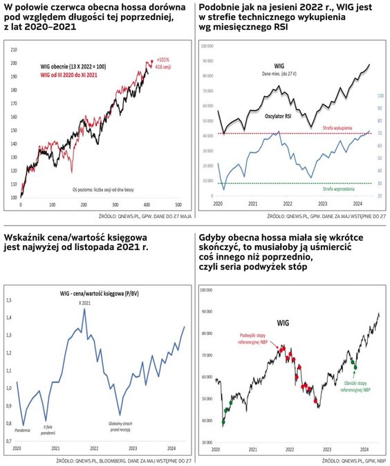 Czerwiec będzie ciekawym miesiącem na warszawskiej giełdzie pod względem pewnego historycznego porównania. Mniej więcej w połowie tego miesiąca czas trwania obecnej hossy, trwającej od października 2022, zrówna się z czasem trwania poprzedniego rynku byka, czyli tego rozpoczętego po pandemicznym krachu w marcu 2020 i zakończonego w listopadzie 2021 (ten czas to dokładnie 416 sesji od dołka).