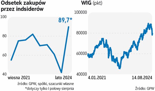 Wraz z dojrzewaniem hossy sytuacja się zmieniła: w transakcjach insiderskich zaczęło przybywać sprzedaży. W efekcie doszło do ciekawej sytuacji. W maju 2024 r., kiedy optymizm na rynku był rekordowy i WIG ustanowił historyczny rekord, rekordowo wysoki był też odsetek sprzedaży przez insiderów. Najwyższy, odkąd „Parkiet” zbiera dane. Od tego czasu obserwujemy pogorszenie nastrojów na rynkach. Umiarkowanym optymizmem napawa analiza transakcji z ostatnich dwóch tygodni, ale jest to zbyt krótki okres, żeby wyciągać z niego daleko idące wnioski. Być może wysoki odsetek zakupów to efekt dokupowania walorów po drastycznej przecenie z 5 sierpnia.