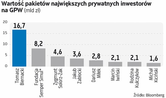 Aktualnie w pierwszej dziesiątce największych akcjonariuszy spółek notowanych na warszawskiej giełdzie nie znajdziemy inwestorów indywidualnych. Listę otwiera Skarb Państwa z pakietem wartym obecnie 96 mld zł, a za nim jest SP Republiki Czech (spółka CEZ). Dalej mamy inwestorów finansowych, w tym fundusze emerytalne. Natomiast na jedenastym miejscu pojawia się Tomasz Biernacki, prezes i największy akcjonariusz sieci sklepów Dino.