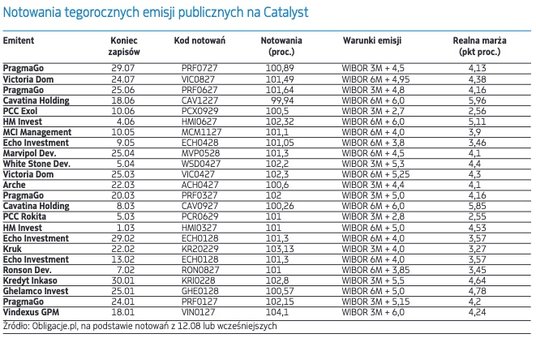 Emisje publiczne kierowane do szerokiego grona inwestorów na podstawie memorandów i prospektów emisyjnych cieszą się rosnącą popularnością. Doskonałym przykładem przewagi kupujących jest lipcowa emisja obligacji Bestu, w której inwestorzy złożyli zapisy ponadpięciokrotnie przewyższające wartość oferty (Best w sierpniu ponowił ofertę, ale zaoferował nieco niższą marżę). Łatwą do przewidzenia konsekwencją jest późniejszy wzrost notowań obligacji po ich wprowadzeniu do notowań na Catalyst.