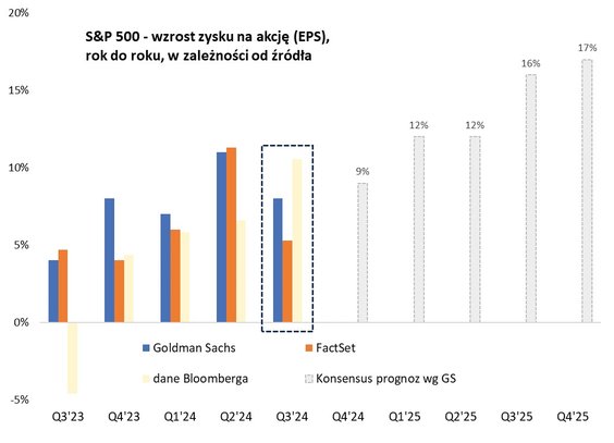 Zacznijmy od próby ustalenia tego, jak wypadł III kwartał. Okazuje się, że zadanie to nie należy wcale do najłatwiejszych. Podczas gdy firma FactSet podaje, że EPS urósł o nieco ponad 5 proc. rok do roku (względem III kwartału 2023 r.), to Goldman Sachs mówi o ok. 8 proc., a nasze obliczenia na podstawie danych agencji Bloomberg pokazują 10 proc.