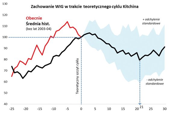 Powody są dwa. Po pierwsze, zmierzający ku końcowi listopad to data teoretycznego szczytu cyklu Kitchina. Po drugie, ostatnie zachowanie WIG już teraz przypomina bardziej fazę spadkową niż wzrostową tego cyklu – w trakcie wtorkowej sesji indeks znalazł się poniżej dołka paniki z początku sierpnia. Gdyby listopad miał skończyć się na poziomie zbliżonym do tego z momentu pisania tego artykułu, na wykresie opartym na danych miesięcznych WIG byłby najniżej od dziesięciu (!) miesięcy.