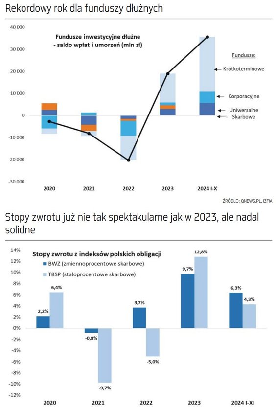 Niewątpliwie 2024 rok należy zaliczyć do bardzo udanych w tej klasie aktywów. Najlepszym dowodem niech będą dane o napływach kapitału do funduszy inwestycyjnych dłużnych. Już po październiku skumulowane saldo wpłat i umorzeń w tej kategorii funduszy przekroczyło rekordowe 35 mld zł i było dużo większe niż w całym 2023, o poprzednich kilku latach już nawet nie wspominając. Kapitał płynie w największym stopniu do funduszy dłużnych krótkoterminowych, aczkolwiek ten rok był też udany dla napływów do funduszy obligacji korporacyjnych oraz tzw. uniwersalnych.