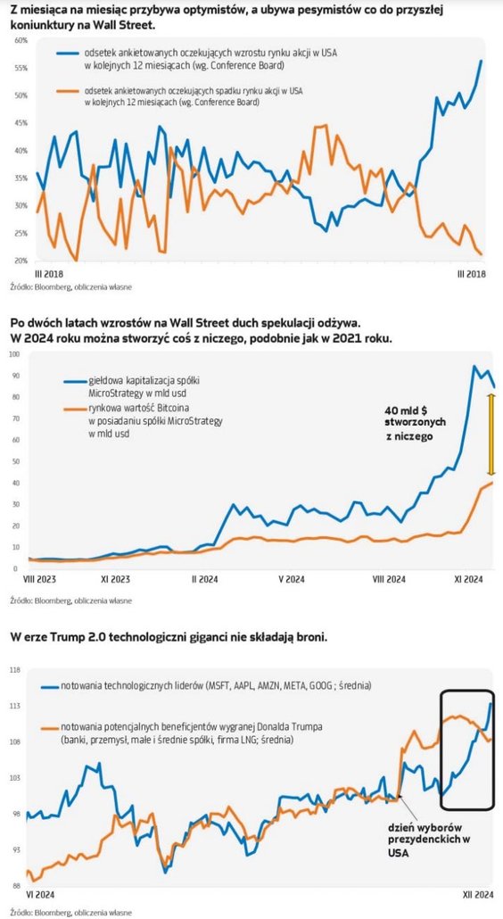 Najbardziej spektakularne podobieństwo tegorocznej powyborczej euforii i ostatnich tygodni pandemicznej fali hossy (2020–2021) widać jednak na rynku kryptowalut. Jednym z głównych rozgrywających jest tu firma Microstrategy, do której należy ponad 2 proc. zasobów bitcoina, wartych dziś około 40 mld dol. Giełdowa wycena tej firmy, której podstawowa działalność generuje jedynie 0,5 mld dol. przychodów i to ze znikomym zyskiem, wynosi 85 mld dol. Jak wyjaśnia charyzmatyczny szef tej spółki Michael Saylor, ta na pozór absurdalna premia w wycenie jest uzasadniona stosowaniem inteligentnej strategii lewarowania z wykorzystaniem obligacji zamiennych na akcje. Przyznaję, że mogę nie rozumieć zawiłości tej strategii, która od marca bieżącego roku do dziś zdołała wytworzyć (w gruncie rzeczy z niczego) ponad 40 mld dol., ale ważne jest to, że uwierzyło w nią wielu inwestorów i analityków. Po raz ostatni równie łatwo było generować wirtualną wartość podczas hossy na rynku niewymienialnych tokenów (NFT) w 2021 roku.