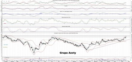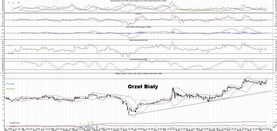 Jeśli popatrzeć na wykresie w ujęciu 8-9 miesięcy to widać spodek, a następnie wyjście górą i dwie korekty w kształcie ucha. Teraz cena jest w fazie podejścia pod szczyt trendu przy 17,35 zł. Pokonanie tego poziomu powinno zainicjować kolejną falę zwyżek. Warto dodać, że wskaźniki mają duży potencjał wzrostowy. Przykładowo – MACD zakręca właśnie nad linią 0.  Ponadto RSI i Stochasti są w pasmach neutralnych.