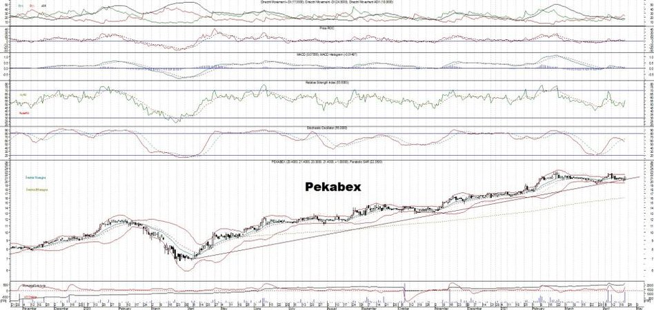 Przedostatnia propozycja to Pekabex. Na wykresie mamy trend wzrostowy, ale przy 22,5 zł zarysowała się formacja podwójnego szczytu. Nie ma ryzyka zmiany kierunku?