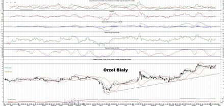 To co mi się ostatnio podoba, że kurs rośnie powoli, dostojnie, lekko nad wstęgą Bollingera. Tej hiperbolizacji tutaj nie widać, co w moim odczuciu sprzyja utrzymaniu trendu w dłuższym horyzoncie. Wskaźniki są już wykupione, więc podobnie jak we wcześniejszych fazach możliwe jest zatrzymanie i tworzenie bazy na kolejnym „piętrze" cenowym. Widać na wykresie cykliczne zawężenie wstęg i następujące po tym wybicie, co również wygląda zachęcająco.