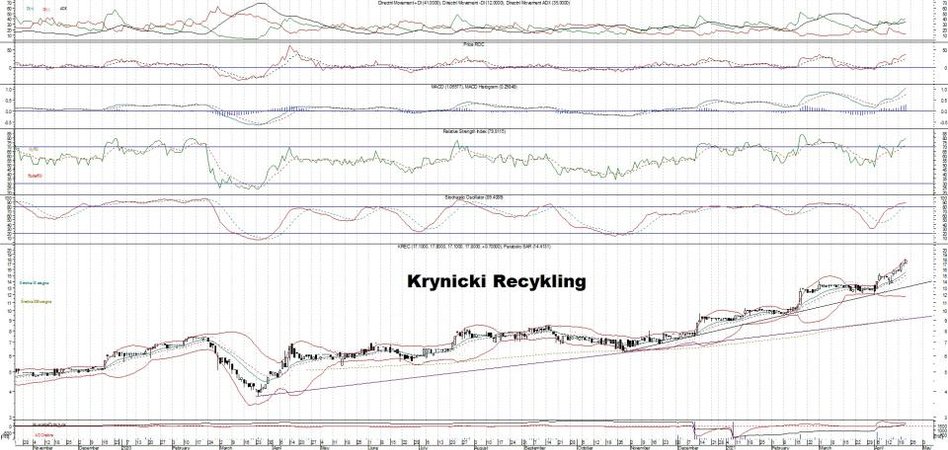 Piąta propozycja do Krynicki Recykling, a więc wskazanie w duchu „green is good". Kurs jest w mocny trendzie wzrostowym. W ciągu roku wzrósł z 3,7 zł na 17,8 zł. Będzie więcej?