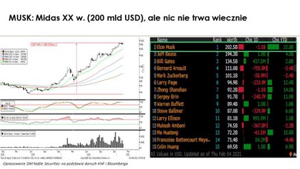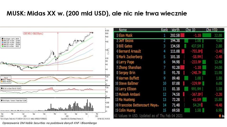 Mamy swego rodzaju nową odsłonę Midasa. Każda hossa ma swoich bohaterów i Musk niewątpliwie nim jest. Mówią tu zarówno o zmianie wyceny Tesli, jego majątki i zasięgach w mediach społecznościowych. Uczulam jednak, że gra pod jego tweety, choć kusząca, to może skończyć się sporymi stratami. Widać bowiem, jak wysoką zmienność wywołują czasem te wpisy.