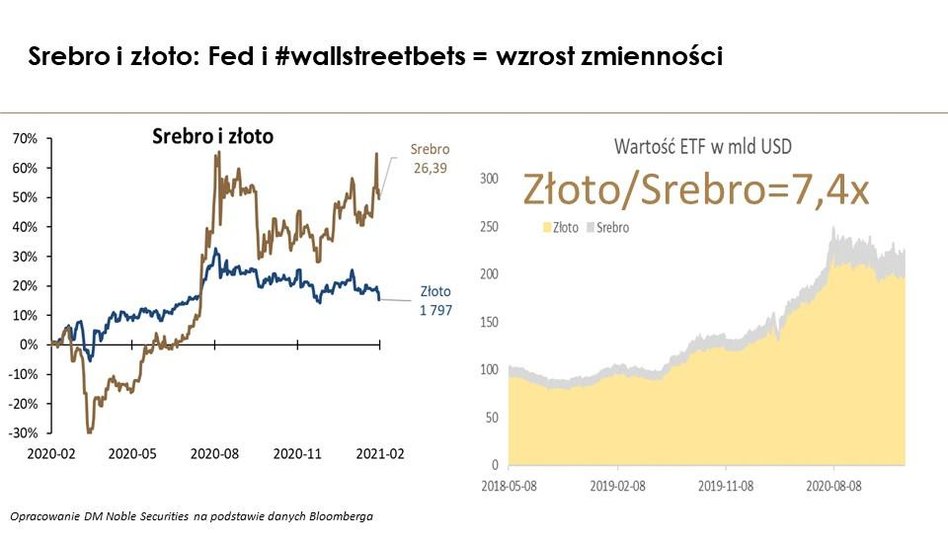 W krótkim terminie oczekuje podtrzymania wysokiej zmienności na srebrze. Widać na rynkach podwyższony apetyt na ryzyko, który wspomniana akcja tylko podsyca. Trzeba jednak pamiętać, że jest to duża spekulacja i należy liczyć się z możliwością poniesienie dużych strat. W dłuższym horyzoncie zwróciłbym uwagę, że srebro stanowi alternatywę do złota i, choć spóźnione, podąża właśnie za nim. A że środowisko monetarne sprzyja kruszcom, to te perspektywy są optymistyczne. Poza tym srebru sprzyja popyt z rosnącego sektora fotowoltaiki, więc jest to kolejny argument in plus.