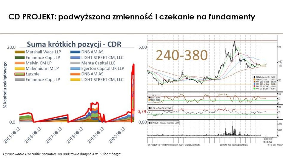 Według danych KNF, Melvin zszedł z krótkimi pozycjami na CDR poniżej 0,5 proc. kapitału zakładowego, więc "akcja" chyba się udała. Skala zmian i obroty wskazują na to, że to co działo się za oceanem zostało u nas podchwycone. Zaakcentowałbym bym jednak to, że na tej sesji z najwyższymi obrotami za 2/3 odpowiadały domy maklerskie obsługujące instytucje. To potwierdza ten romantyczny mit, o którym wspominałem. Co do fundamentów – inwestorzy czekają na dane o sprzedaży Cyberpunka w 2020 r. i szacunkowe wyniki za ten okres. Istotne będą też dane o styczniowej sprzedaży i to, czy po patchu gra wróci na półki Sony. Od przyjęcia tych danych zależeć będzie to, czy 250 zł było dołkiem czy nie.