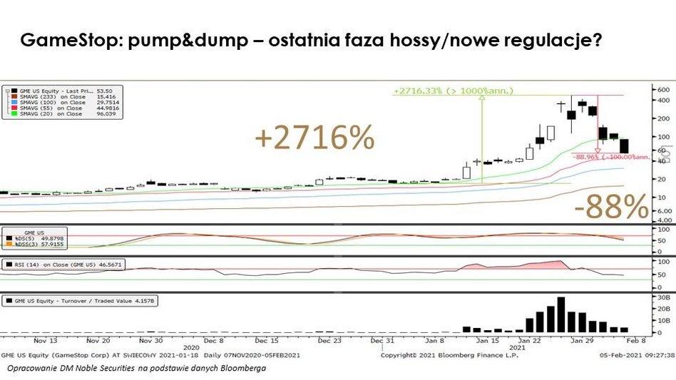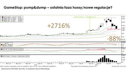 Warto zauważyć, że od początku roku do szczytu akcje GameStop zyskały ponad 2700 proc., by następnie spaść w kilka sesji o 88 proc. Mamy więc do czynienia z typowym zjawiskiem "pump and dump". Jest w tym nuta romantyzmu, gdy prasa opisuje to zjawisko, jako zemstę inwestorów detalicznych. Ja jednak zwróciłbym uwagę, że fundusze też się podłączyły i niektóre zarobiły nawet po 700 mln USD. W tym kontekście nie do końca jest to rewolucja detalu. Jakie mogą być tego implikacje? Być może zaostrzenie zasad dotyczących widełek cenowych i zawieszania handlu, a więc po prostu – jeszcze większe doregulowanie rynków.
