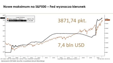 Moim zdaniem rynkami kapitałowymi rządzą banki centralne, co potwierdza porównanie sumy bilansowej Fedu z wykresem S&P500. Widać klarownie dodatnią korelację. Gdy pojawia się ryzyko podwyżek stóp czy zaciskania monetarnego pasa, to indeks spada, jak chociażby na początku 2018 r. Wydaje mi się, że dopóki USA nie uzyska odporności stadnej na covid-19, dopóty raczej nie ma mowy o zaostrzeniu tej polityki. W związku z tym zakładam, że czwartkowy rekord nie jest ostatnim w tej hossie. Oczywiście krótkoterminowe korekty są możliwe, ale wątpię by Fed pozwolił, aby ich głębokość przekroczyła kilkanaście procent.