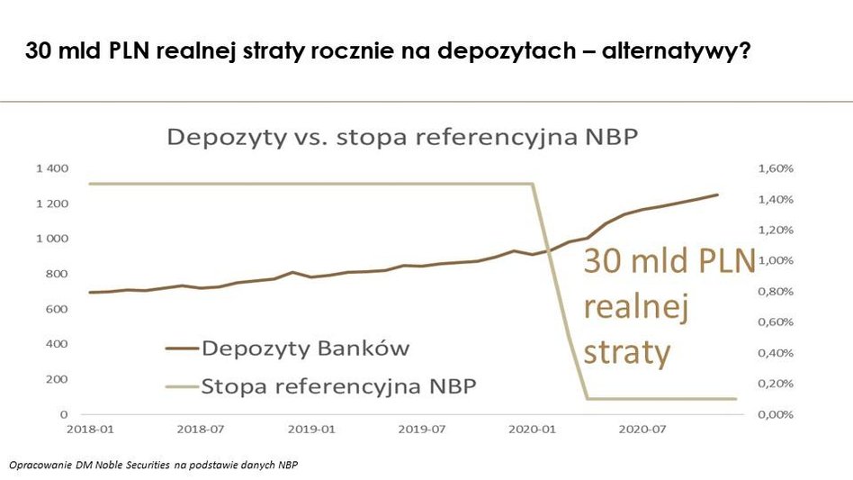 Lokaty są oprocentowane w okolicy 0-0,1 proc. , a inflacja konsumencka sięga około 2,4 proc. Przy łącznej wartości depozytów sięgającej 1,2 bln zł, można szacować, że roczna realna utrata siły nabywczej zgromadzonych w ten sposób środków wynosi 30 mld zł. Jeśli inflacja wzrośnie, to straty te będą wyższe. To jest bardzo istotne dla aktualne sytuacji ekonomicznej, bo zachęca do szukania alternatywnych lokat kapitału. Wydaje mi się, że to właśnie stąd bierze się wciąż dobra, mimo pandemii, kondycja rynku mieszkaniowego, a także ożywienie na polskiej giełdzie, czy to na rynku pierwotnym czy chociażby na NewConnect. Można powiedzieć, że tak wygląda polski wymiar luzowania ilościowego...