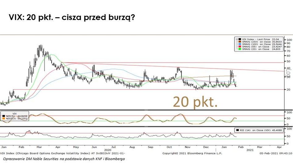 Ostatni rok pokazał, że gdy VIX schodzi do 20 pkt, to następuje stabilizacja, a potem ruch w górę pod wpływem pojawienia się czynnika niepewności. W związku z tym, że indeks dochodzi teraz do tej wartości, to wydaje mi się, że pytanie nie brzmi "czy?", ale kiedy dojdzie do wzrostu obaw, co może spowodować korektę na Wall Street. Podsumowując – u mnie niskie odczyty indeksu strachu strach zwiększają.