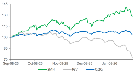 Rzeczywiście, co tydzień są jakieś nowe ważne wydarzenia. Teraz mamy wyniki spółek za czwarty kwartał 2025 r. Na wykresie S&P 500 dużej zmienności de facto nie widać. On się konsoliduje. Widzimy na giełdach zagranicznych rotację kapitału. Rynki poza Stanami Zjednoczonymi rosną mocniej. Jeśli chodzi o S&P 500, to jego odbiciu do października przewodziło dosyć wąskie grono spółek technologicznych. W listopadzie mieliśmy pierwszą lekką korektę. Spółki high growth, te bardziej spekulacyjne dosyć mocno spadły. W niektórych branżach spadki się dalej pogłębiają. Widać też rotację kapitału z sektora technologicznego do tych branż starej ekonomii, będących w ostatnim czasie w tyle. Obserwowaliśmy silniejsze zachowania spółek surowcowych, przemysłowych, energetycznych.