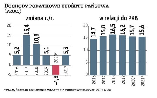 Także w relacji do wartości PKB wpływy z podatków nie odbudują się do poziomów sprzed pandemii. W 2019 r. było to bowiem 16,2 proc. PKB, w 2020 r. wskaźnik ten ma spaść do 15,7 proc., a w 2021 r. – do 15,6 proc.