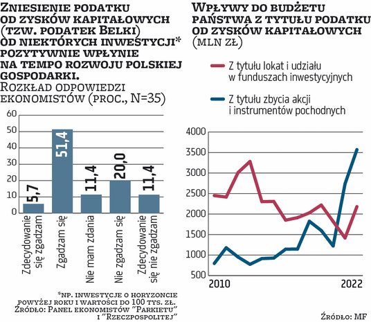 O obniżeniu tej stawki nie mówi dzisiaj żadna z sił politycznych. Większość jednak chciałaby, aby przynajmniej część inwestycji była z podatku od zysków kapitałowych zwolniona. Najdalej idzie Trzecia Droga, która proponuje, aby całkowicie zwolnić z tej daniny osoby fizyczne, a w okresie podwyższonej inflacji nie pobierać jej w ogóle. Konfederacja opowiada się za zniesieniem podatku Belki od lokat i obligacji, z kolei Platforma Obywatelska i Bezpartyjni Samorządowcy proponują, aby zwolnione były wszelkie inwestycje o wartości do 100 tys. zł. W pomyśle PO dodatkowym warunkiem zwolnienia byłby co najmniej roczny horyzont inwestycji.