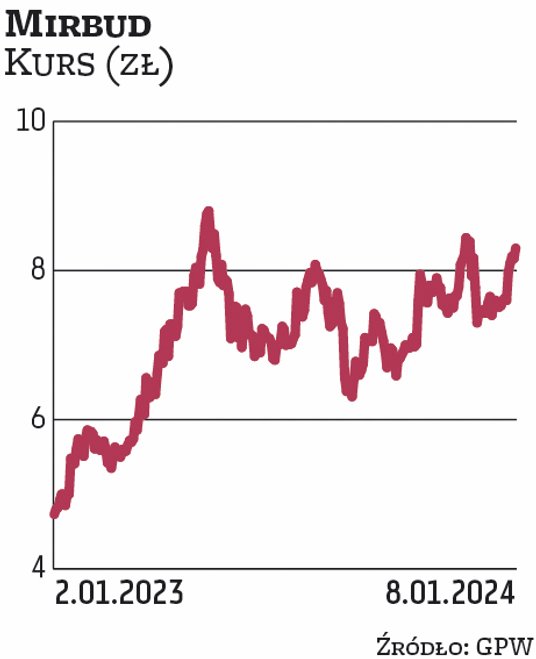 Mirbud jest faworytem BM BNP. Zarząd Mirbudu ocenia, że 2024 r. powinien być podobny do 2023 r. pod względem przychodów. Spółka chce utrzymać marżę brutto na sprzedaży na poziomie powyżej 8 proc. Narastająco w okresie trzech kwartałów 2023 r. marża wyniosła 8,5 proc. i była wyższa rok do roku o 0,5 pkt proc.