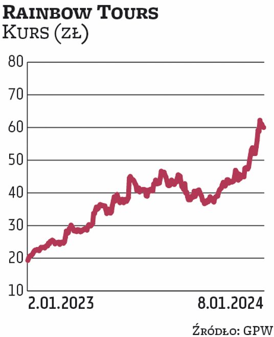 Na Rainbow Tours postawiły dwa biura: BNP Paribas oraz Millennium. Turystyczna spółka ma za sobą udany rok. W grudniu 2023 r. zarząd postanowił o wypłacie drugiej zaliczki na poczet dywidendy przewidywanej na koniec roku obrotowego. To 2 zł na walor. Dniem ustalenia prawa będzie 24 stycznia, a wypłaty 31 stycznia.