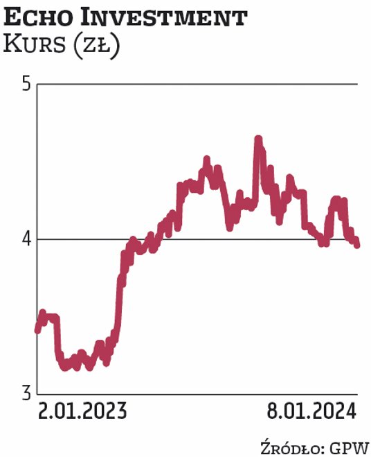 Notowania Echo Investment w 2023 r. urosły, ale słabiej niż szeroki rynek. Na początku stycznia walory deweloperskiej spółki były wyceniane na 3,41 zł, a rok zakończyły z kursem wynoszącym 4 zł i obecnie utrzymują się na tym poziomie. Zdaniem analityków BM BNP Paribas istnieje jeszcze potencjał do zwyżki.