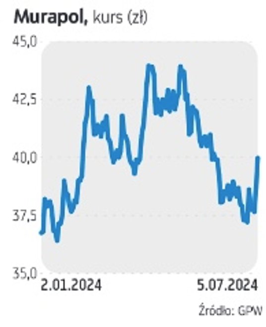 Na Murapol stawia BM PKO BP. Obecnie notowania akcji oscylują w okolicach 38–39 zł. Na początku roku kurs był na zbliżonym poziomie. Spółka zadebiutowała na GPW 15 grudnia 2023 r. z kursem odniesienia wynoszącym 33 zł. Murapol w tym roku wypłacił akcjonariuszom 80,4 mln zł z zysku netto za 2023 r., co dało 1,97 zł dywidendy na akcję.