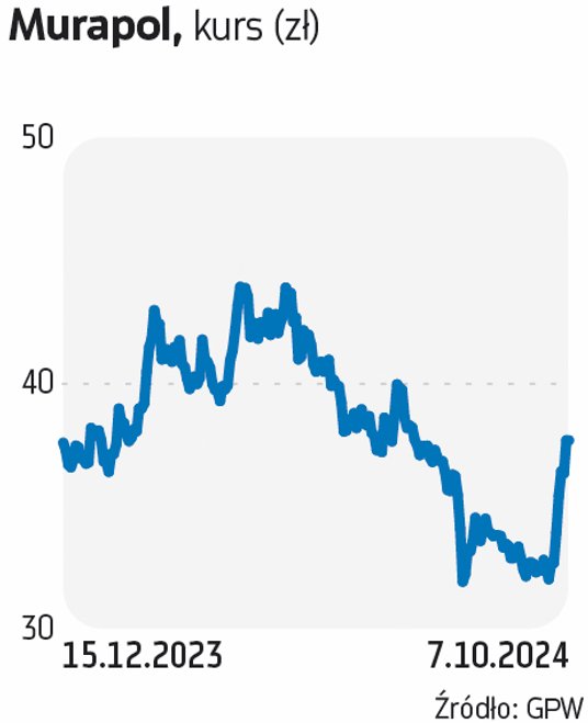 Murapol zadebiutował na GPW pod koniec 2023 r. Akcje w IPO sprzedawano po 33 zł. Aktualnie kurs oscyluje w okolicach 37 zł, co przekłada się na kapitalizację sięgającą 1,5 mld zł. Do portfela na IV kwartał spółkę dodały dwa podmioty: BM PKO BP oraz BM BNP Paribas BP. Murapol dzieli się zyskiem – wypłaci zaliczkę na poczet dywidendy za 2024 r.