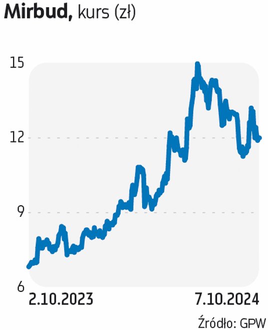 W ciągu roku akcje Mirbudu podrożały o prawie dwie trzecie. Notowania osiągnęły szczyt w lipcu 2024 r. Od tego czasu dominuje podaż. Aktualnie kurs jest na poziomie 11–12 zł, co przekłada się na kapitalizację sięgającą 1,3 mld zł. W zwyżkę wyceny Mirbudu wierzy BM BNP Paribas BP, który wytypował spółkę do portfela na IV kwartał.
