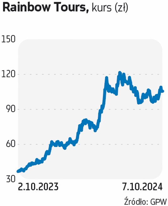 Rainbow Tours ma za sobą dobre kwartały. Wraz z poprawiającymi się wynikami w górę idą notowania akcji. Ale od sierpnia wzrosty wyhamowały, a kurs przeszedł w trend boczny. Obecnie wynosi około 104 zł. Jest o ponad 170 proc. wyżej niż 12 miesięcy temu. Na dalszą zwyżkę wyceny Rainbow Tours stawia BM BNP Paribas BP.