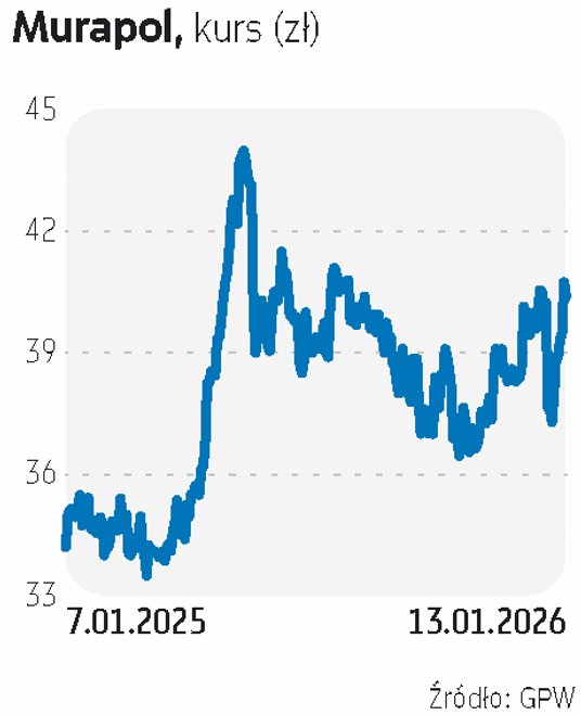 Jesienią zeszłego roku akcjonariusz Murapolu, Aeref V PL Inwestycje, w ramach ABB sprzedał pakiet akcji po 39 zł za sztukę. Obecnie kurs oscyluje w okolicach 42 zł wobec 35 zł dwanaście miesięcy temu. Zarząd deweloperskiej spółki spodziewa się, że obecny rok będzie dla niej dobry. Do portfela na I kwartał firmę wytypowało BM PKO BP.