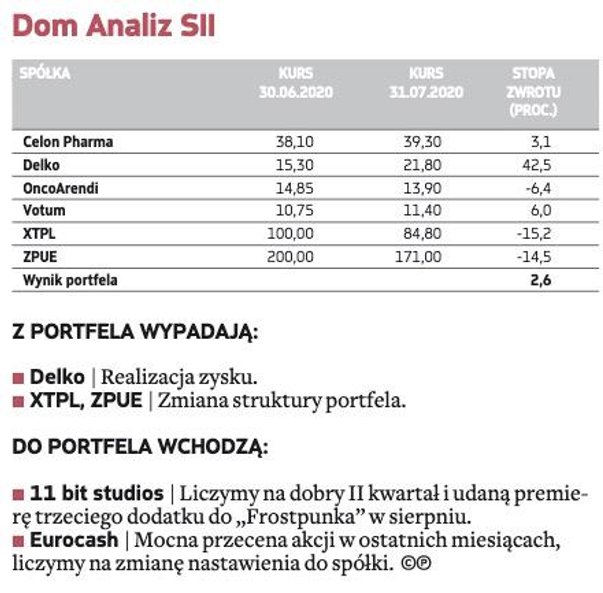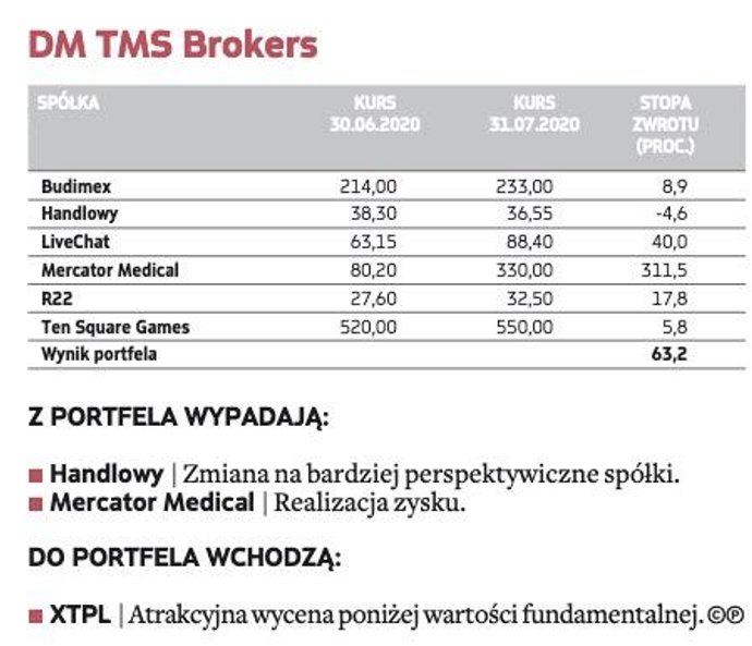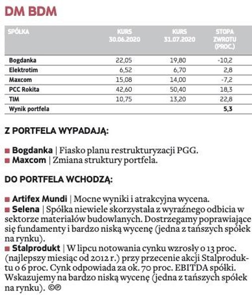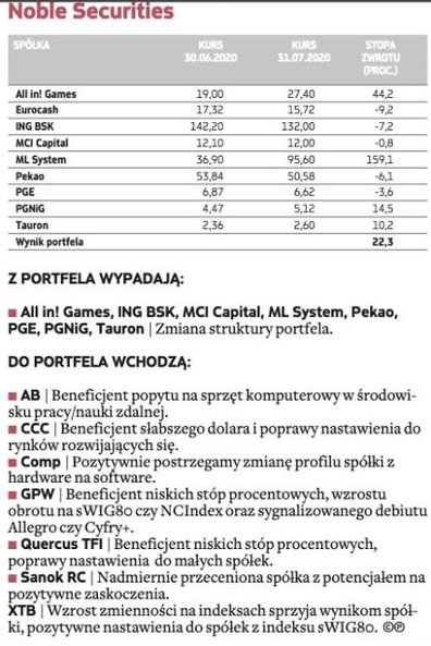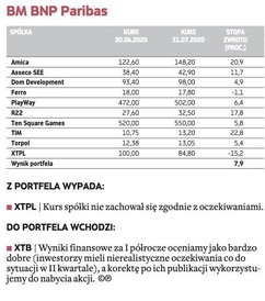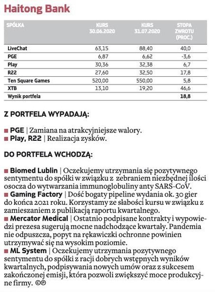 W gronie małych firm największe nadzieje eksperci wiążą z XTB – ta spółka znalazła się w trzech portfelach na sierpień. Broker jest jednym z największych beneficjentów nadzwyczajnej rynkowej zmienności wywołanej pandemią. Większa aktywność inwestorów oraz napływ nowych klientów przełożyły się na dużo wyższe wpływy. – Wyniki finansowe za I półrocze oceniamy jako bardzo dobre (inwestorzy mieli nierealistyczne oczekiwania co do sytuacji w II kwartale), a korektę po ich publikacji wykorzystujemy do nabycia akcji – argumentują eksperci BM BNP Paribas.