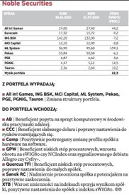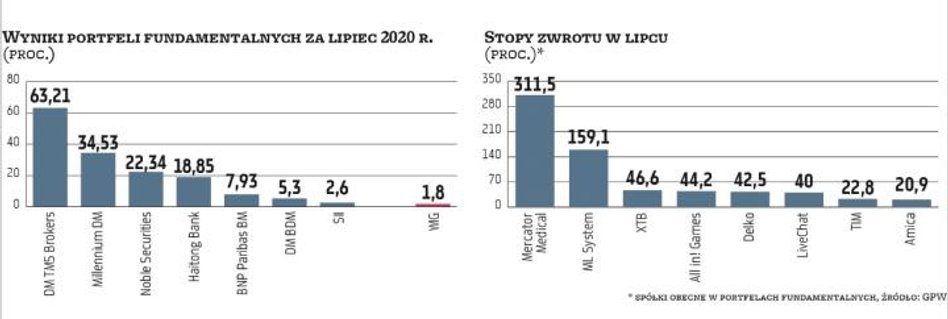 W lipcu eksperci mieli ułatwione zadanie, ponieważ akcje zdecydowanej większości spółek z szerokiego rynku akcji, najliczniej reprezentowanych w portfelach, kontynuowały pozytywny trend z poprzednich miesięcy. Dwucyfrowe stopy zwrotu nie były niczym nadzwyczajnym w segmencie spółek o mniejszej kapitalizacji. Nie brakowało firm, które pokusiły się nawet o trzycyfrowe zyski. Dwie z nich – ML System, Mercator Medical – znalazły się w składzie portfeli na lipiec. Na tę ostatnią firmę postawili analitycy DM TMS Brokers, co miało istotny wkład w rewelacyjny lipcowy wynik ich portfela: udało im się wypracować ponad 63 proc. zysku. Wyprzedzili analityków Millennium, których portfel powiększył się o 34,5 proc. W pierwszej trójce znaleźli się również eksperci z Noble Securities, którzy zwiększyli swój stan posiadania o 22,3 proc. Powody do zadowolenia mogą mieć także pozostali uczestnicy rywalizacji. Wszystkie portfele w lipcu wypracowały bowiem wyniki lepsze od rynku.