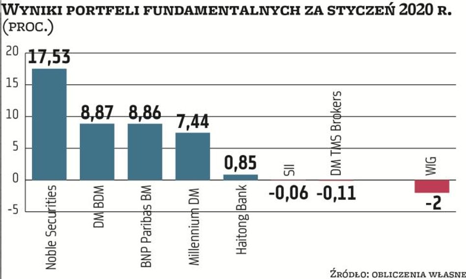 Przed miesiącem wystartowała ósma edycja portfeli fundamentalnych „Parkietu". Do rywalizacji w 2020 roku przystąpiło siedem domów maklerskich. Za zadanie mają typowanie spółek z mocnymi fundamentami, mogących zapewnić solidne stopy zwrotu. Czas na pierwsze tegoroczne podsumowanie wyników.