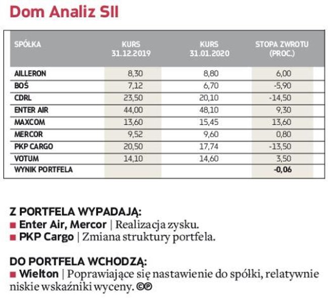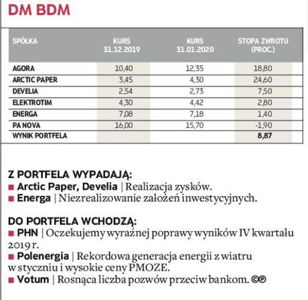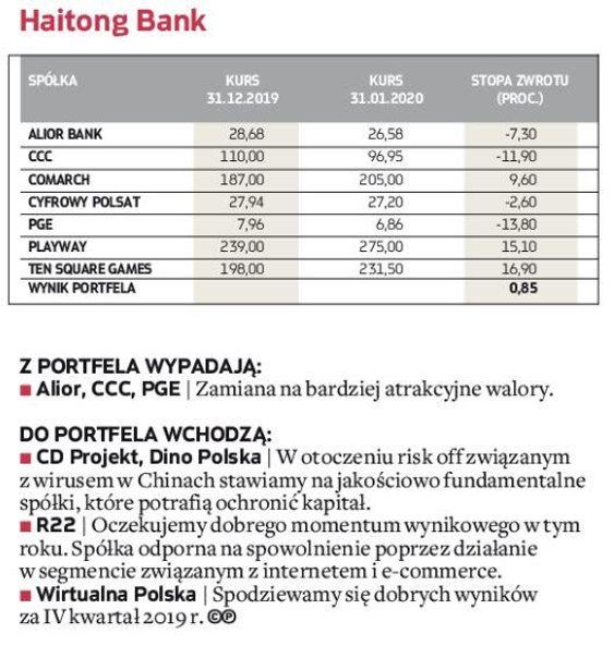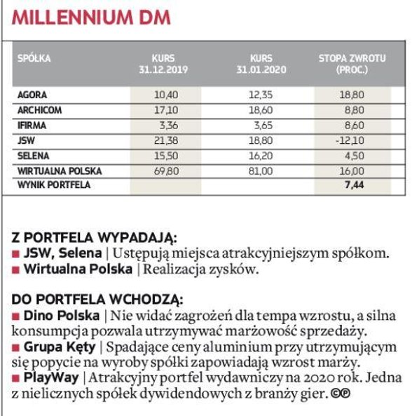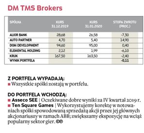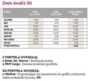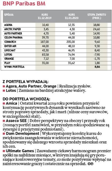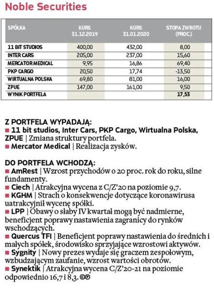 W zakończonym miesiącu bezkonkurencyjny okazał się portfel zarządzany przez analityków Noble Securities, którzy pokazali, że w tej edycji portfeli też mogą się liczyć w walce o czołowe lokaty (w 2019 r. zajęli drugie miejsce). W styczniu udało im się wypracować efektowną 17,5-proc. stopę zwrotu, wyprzedzając analityków DM BDM, których portfel zwiększył wartość o 8,9 proc. W pierwszej trójce znaleźli się również eksperci z BNP Paribas BM, zwiększając w pierwszym miesiącu rywalizacji stan portfela o 8,9 proc. Pozostali uczestnicy musieli się zadowolić skromniejszym wynikiem, ale wszystkim udało się pokonać rynek. Portfel ubiegłorocznego triumfatora – Haitong Banku – zarobił jedynie 0,9 proc. Broker ten miał jednak największą ekspozycję na segment spółek z WIG20, co miało istotny wpływ na styczniowy wynik.