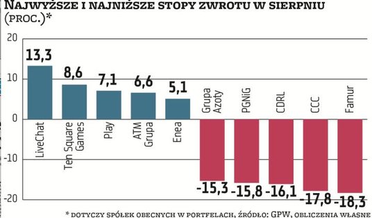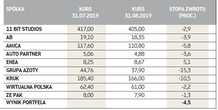 Doszło do istotnych roszad w składach portfeli. Wytypowane przed miesiącem firmy nie spełniły pokładanych nadziei. O ile przed miesiącem eksperci chętnie pomijali spółki z WIG20, o tyle teraz właśnie w papierach krajowych potentatów pokładają nadzieje na odrobienie sierpniowych strat. To tylko pokazuje, jak dynamicznie zmienia się sytuacja na krajowym rynku akcji. Po solidnej wyprzedaży z minionego miesiąca wyceny rynkowe niektórych dużych firm okazały się na tyle przekonujące, że nasi eksperci dostrzegli w nich kandydatów do odbicia, na których warto postawić we wrześniu. Na ich celowniku znalazły się walory KGHM, Lotosu, mBanku, Orange, które dołączyły do obecnych już w portfelach CCC, PGNiG i Playa.