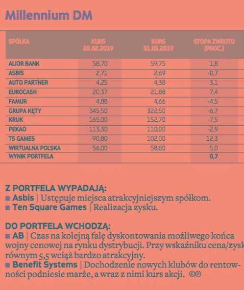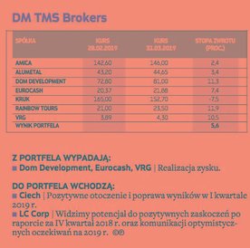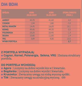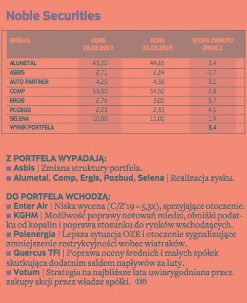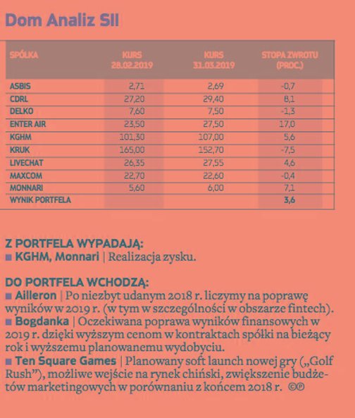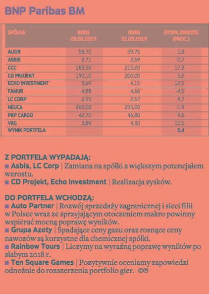 Biorąc pod uwagę konkretne branże, uwagę zwraca utrzymujące się zainteresowanie spółkami z ekspozycją na rosnącą konsumpcję (Rainbow Tours, Enter Air, Auto Partner, Benefit Systems). Po dłuższym okresie nieobecności w portfelu eksperci dostrzegli potencjał w papierach firm chemicznych (Ciech, Grupa Azoty), które dzięki lepszemu otoczeniu rynkowemu mają szansę poprawić swoje wyniki w 2019 r. Swoich zwolenników w dalszym ciągu mają wyróżniające się firmy przemysłowe, za którymi przemawiają atrakcyjne wyceny i rosnące przychody, będące efektem ekspansji biznesu na nowe rynki.
