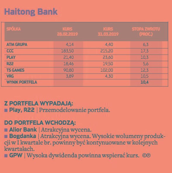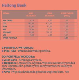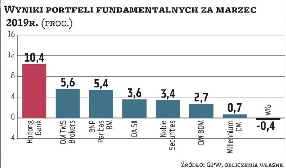 W zakończonym miesiącu najbardziej zyskowny okazał się portfel zarządzany przez analityków z Haitong Banku. Marzec zamknęli rewelacyjnym wynikiem, wypracowując ponad 10-proc. stopę zwrotu, zostawiając w tyle DM TMS Brokers i BNP Paribas BM, których przedstawiciele w ciągu miesiąca zwiększyli stan posiadania odpowiednio o 5,6 i 5,4 proc. Pozostali uczestnicy rywalizacji musieli się zadowolić skromniejszym zarobkiem.