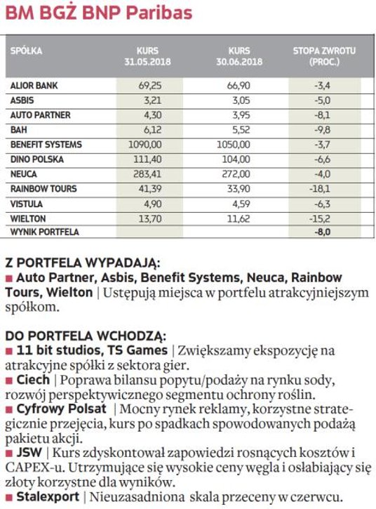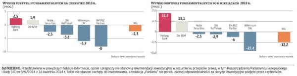 Za nami pierwsze półrocze rywalizacji ekspertów od inwestowania w spółki na podstawie fundamentów. Z wyjątkiem stycznia okres ten nie był udany dla inwestujących w akcje z warszawskiej giełdy z uwagi na pogorszenie koniunktury na rynku. Mniejsze spółki w dalszym ciągu pozostawały w odwrocie, a co gorsza, w ostatnich miesiącach segment dużych firm złapał zadyszkę. Część spółek, które do tej pory były główną siłą napędową portfeli, w ostatnim czasie wytraciło impet, a inne pogłębiły korektę. Dlatego w składach portfeli na kolejny miesiąc pojawiło się sporo nowych propozycji.