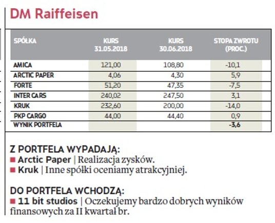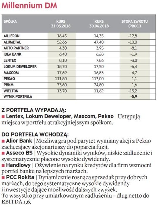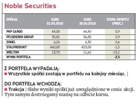 W zakończonym miesiącu najbardziej zyskowny okazał się portfel stworzony przez analityków Haitong Banku, którym udało się wypracować 2,5-proc. stopę zwrotu. Wyprzedzili ekspertów DM BDM, których portfel zakończył miesiąc 1,9 proc. na plusie. W pierwszej trójce znalazło się też miejsce dla typujących z Noble Securities, ale w czerwcu zmniejszyli swój stan posiadania o 2,5 proc.