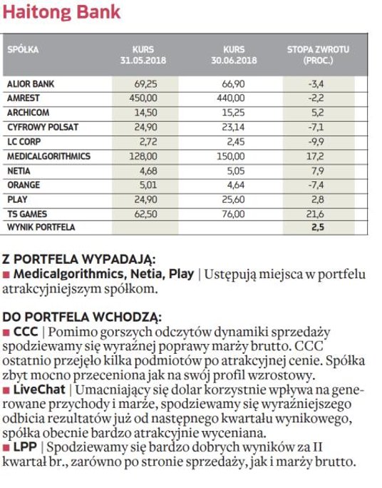 Po sześciu miesiącach tegorocznej rywalizacji, dzięki najlepszemu wynikowi w czerwcu, na prowadzeniu umocnili się analitycy Haitong Banku, którzy mogą się pochwalić stopą zwrotu na poziomie ponad 22 proc. Z kolei portfel wicelidera, DM BDM, jest o 13 proc. grubszy niż na początku tegorocznej rywalizacji. Pozostała czwórka uczestników rywalizacji miała mniej szczęścia i ich obecny stan posiadania jest mniejszy niż na początku stycznia.